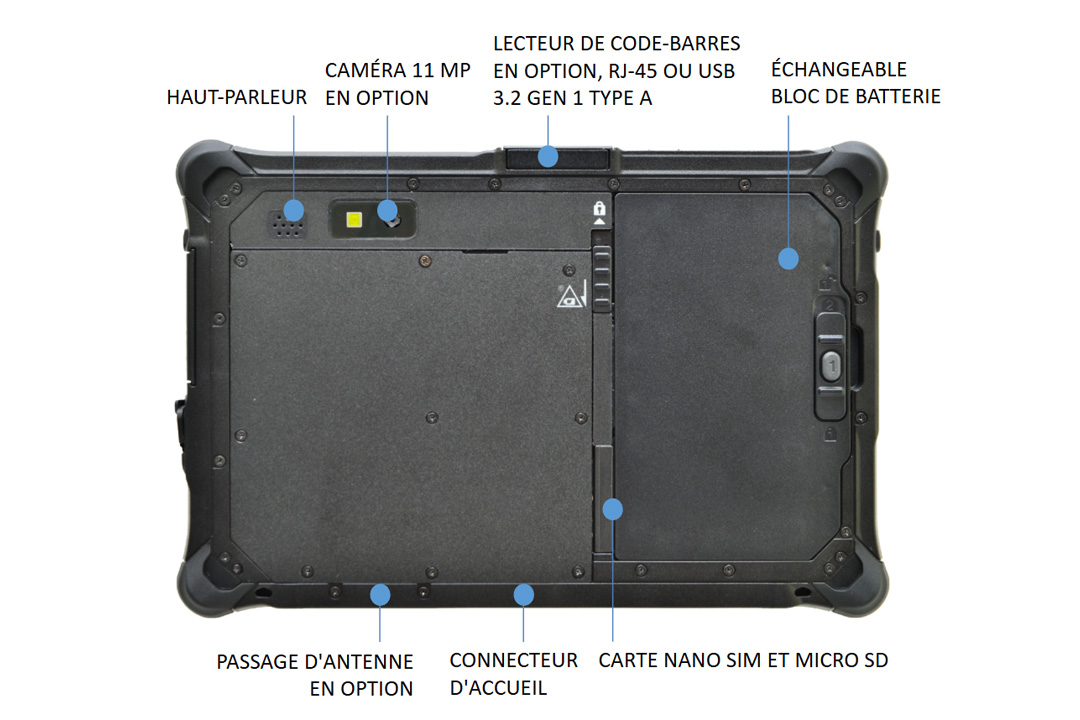 Une caméra frontale 2MP, Wi-Fi 6E et Bluetooth® V5.3, une caméra arrière 11MP optionnelle et un GPS et un haut débit mobile multi-porteuse 4G LTE en option sont également des fonctionnalités de cette tablette polyvalente.