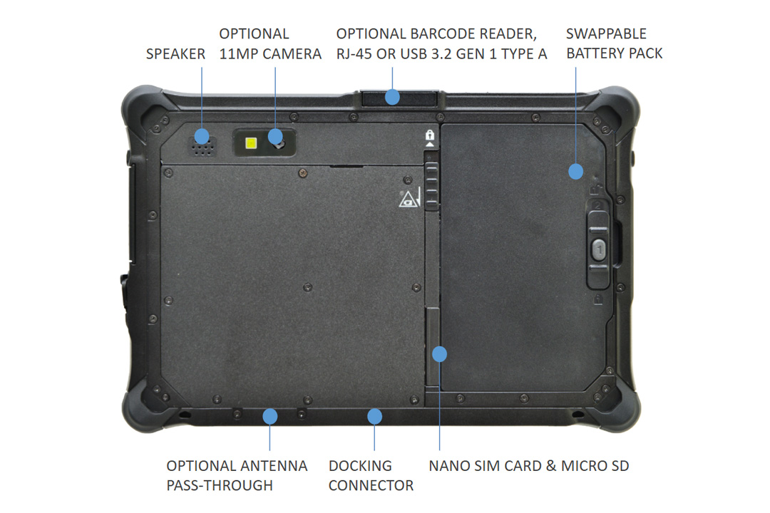 Thanks to its unique design for diverse applications and scenarios, the R8 offers ultimate functionality with its boundless customization capabilities. It features numerous integrated expansion modules for multiple ways to retrieve and transmit information on the move. Optional add-ons include a barcode reader, smart card reader, RFID (NFC) reader, magnet stripe reader, serial port, RJ-45 port and additional USB 3.2 ports. A 2MP front camera, Wi-Fi 6E and Bluetooth® V5.3, optional 11MP rear camera and optional GPS and 4G LTE multi-carrier mobile broadband also are features for this versatile tablet.